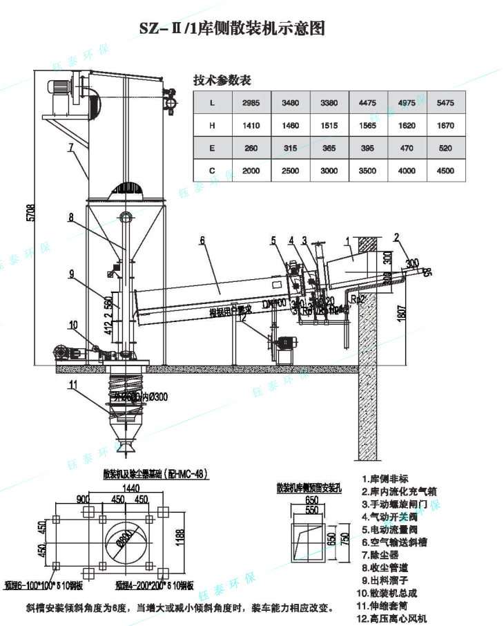 散裝機(jī)自帶除塵器,過(guò)濾面積為64m2,排塵濃度≤30mg/Nm³(滿足國(guó)家環(huán)保有關(guān)標(biāo)準(zhǔn)要求)。