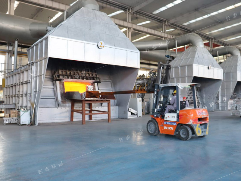 再生鋁雙室爐煙氣處理系統(tǒng)采用XLP高效旋風(fēng)除塵器+強制排風(fēng)冷卻器+脈沖布袋除塵器組成,雙室爐爐門排煙采用2個排煙罩,2個爐門罩交替打開;并配套爐膛排料輔助排煙系統(tǒng),1套雙室爐煙氣處理系統(tǒng)處理風(fēng)量≥130000m3/h。除塵器運行后將雙室爐燃燒過程產(chǎn)生的高溫煙氣(溫度<250℃)和爐門罩排出的煙氣全部收集干凈,保證了工人的操作環(huán)境,達到了規(guī)定的排放標準,給生產(chǎn)企業(yè)帶來了巨大的經(jīng)濟效益。除塵器收集的顆粒污染物主要是熔煉過程中產(chǎn)生的金屬氧化物和非金屬氧化物,還有大量碳?;曳莸龋龎m脫硫后:煙塵濃度:≤10mg/m3。